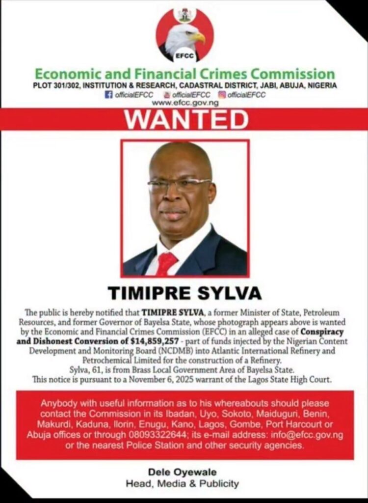 The Economic and Financial Crimes Commission, EFCC, has declared a former Minister of Petroleum Resources and former Governor of Bayelsa State, Timipre Sylva wanted.