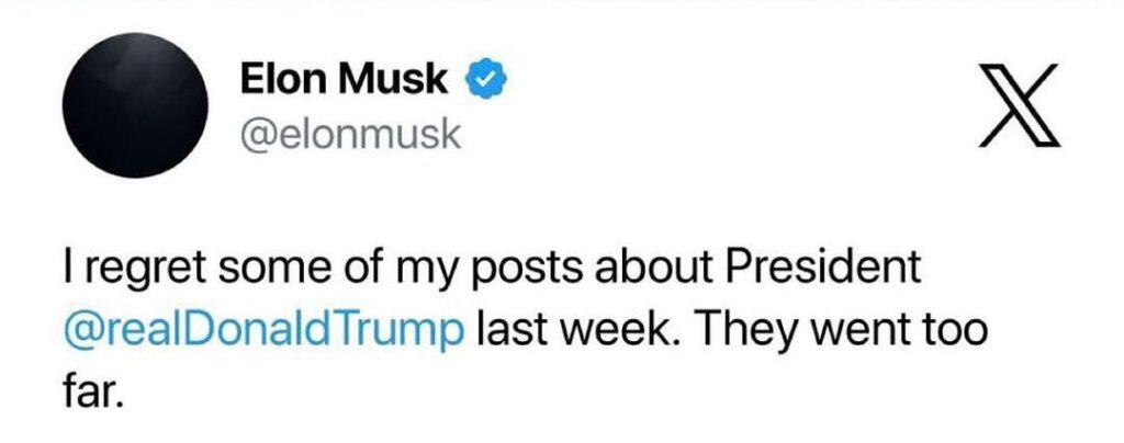 They went too far,β Musk wrote in a brief post on X (formerly Twitter), referring to a series of recent criticisms he had aimed at Trump. Musk said: βI regret some of my posts about President @realDonaldTrump last week. They went too far.β
