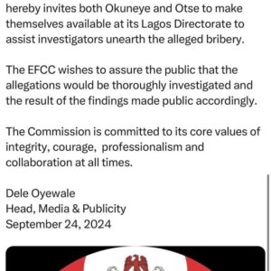 “In a swift reaction, the EFCC’s boss has constituted a team of Investigators to critically look into the allegations. To this end, the Commission hereby invites both Okuneye and Otse to make themselves available at its Lagos Directorate to assist investigators unearth the alleged bribery.”