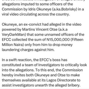 “Okuneye, an ex-convict had alleged in the video powered by Martins Vincent Otse (a.k.a VeryDarkMan) that some unnamed officers of the EFCC collected the sum of N15,000,000 (Fifteen Million Naira) only from him to drop money laundering charges against him.