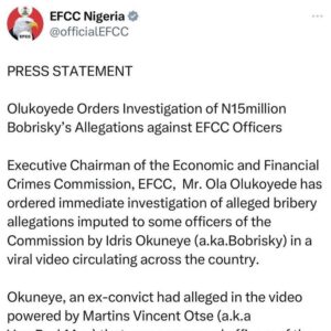 The statement reads: “Executive Chairman of the Economic and Financial Crimes Commission, EFCC, Mr. Ola Olukoyede has ordered immediate investigation of alleged bribery allegations imputed to some officers of the Commission by Idris Okuneye (a.ka.Bobrisky) in a viral video circulating across the country.