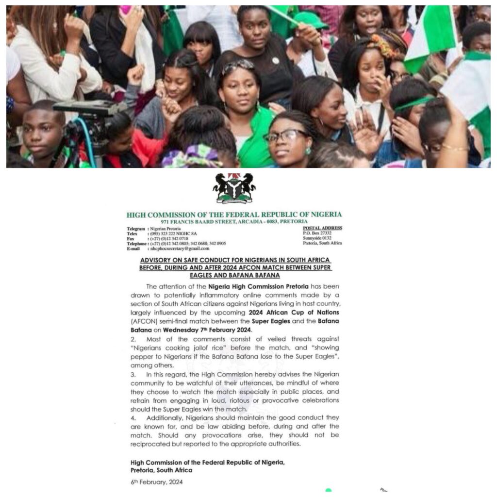 Nigerians in South Africa have been warned to be mindful of where they watch the semi final African Cup of Nations (AFCON) clash between Super Eagles and Bafana Bafana and to equally refrain from wild celebrations should Nigeria win.