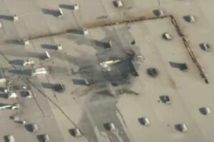 The crash, which occurred in the early afternoon, caused significant damage to the building, with a large hole visible in the roof and smoke billowing out.